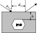 是折射角,ν1,ν2分别是超声波在肝外和肝内的传播速度),超声波在肿瘤表面发生反射时遵循的规律与光的反射规律相同。已知ν2=0.9v1,入射点与出射点之间的距离是d,入射角为θ1,肿瘤的反射面恰好与肝脏表面平行。试求:![]()