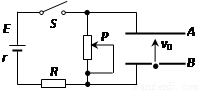 (8分)如图所示的电路中,两平行金属板A、B水平放置,两板间的距离d="40" cm.电源电动势E=24V,内电阻r=1Ω,电阻R=15Ω。将滑动变阻器的滑片放置在某一位置,闭合开关S,待电路稳定后,将一带正电的微粒从B板小孔以初速度v0=4m/s竖直向上射入板间,微粒恰能到达A板。若微粒带电荷量为q=1×10-5C,质量为m=2×10-5kg,不考虑空气阻力(取g=10m/s2).则此时:![]()