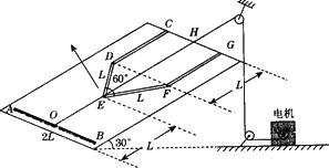 如图所示,在倾角为30°的斜面上固定一光滑金属导轨CDEFG,OH∥CD∥FG,∠DEF=60°,CD=DE=EF=FG=AB/2=L,一根质量为m的导体棒AB在电机的牵引下,以恒定的速度v0沿OH方向从斜面底部开始运动,滑上导轨并到达斜面顶端,AB⊥OH,金属导轨的CD、FG段电阻不计,DEF段与AB棒材料、横截面积均相同,单位长度电阻为r,O是AB棒的中点,整个斜面处在垂直斜面向上磁感应强度为B的匀强磁场中.求: