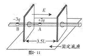 如图所示,沿水平方向放置一条平直光滑槽,它垂直穿过开有小孔的两平行薄板,板相距3.5L。槽内有两个质量均为m的小球A和B,球A带电量为+2q,球B带电量为-3q,两球由长为2L的轻杆相连,组成一带电系统。最初A和B分别静止于左板的两侧,离板的距离均为L。若视小球为质点,不计轻杆的质量,在两板间加上与槽平行向右的匀强电场E后(设槽和轻杆由特殊绝缘材料制成,不影响电场的分布),求: