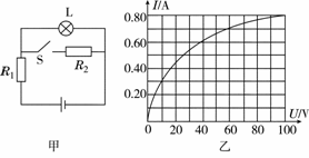 如图甲的电路中R1=R2=100 Ω是阻值不随温度而变的定值电阻.白炽灯泡L的伏安特性曲线如图乙的I-U图线所示.电源电动势E=100 V,内阻不计.求: