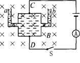 如图所示,一长方形绝缘容器内部高为L,宽为d(前后面距离),左右两侧装有两根开口向上的管子a、b,上、下两侧装有电极C(正极)和D(负极),并经开关S与电源连接.容器中注满能导电的液体,液体的密度为ρ0,将容器置于一匀强磁场中,磁场方向垂直纸面向里.当开关S断开时,竖直管子a、b中的液面高度相同;开关S闭合后,a、b管中液面将出现高度差.