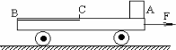 如图所示,光滑水平地面上停着一辆平板车,其质量为2 m,长为L,车右端(A点)有一块静止的质量为m的小金属块.金属块与车间有摩擦,与中点C为界, AC段与CB段摩擦因数不同.现给车施加一个向右的水平恒力,使车向右运动,同时金属块在车上开始滑动,当金属块滑到中点C时,即撤去这个力.已知撤去力的瞬间,金属块的速度为v0,车的速度为2v0,最后金属块恰停在车的左端(B点).如果金属块与车的AC段间的动摩擦因数为μ1,与CB段间的动摩擦因数为μ2,求μ1与μ2的比值.