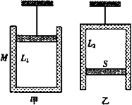 一质量为M、总长度为L的圆柱形汽缸内,有一厚度不计、质量为m、截面积为S的活塞,活塞与汽缸壁间摩擦不计,且不漏气,现用绳子系住活塞将汽缸悬挂起来,如图甲所示,汽缸内气体柱的高度为L1;如果用绳子系住汽缸底,将气缸倒过来悬挂起来,如图乙所示,汽缸内气体柱的高为L2.设两种情况下汽缸都处于竖直状态且温度不变,求此时的大气压强p0