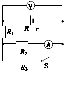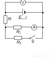 (8分)如图所示的电路中,R1=9Ω,R2=30Ω,S闭合时,电压表V的示数为11.4V,电流表A的示数为0.2A,S断开时,电流表A的示数为0.3A,求:![]()