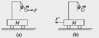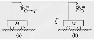 车放在光滑水平面上,小车上用细线悬挂另一质量为m的小球,且M>m.用一力F水平向右拉小球,使小球和小车一起以加速度a向右运动,细线与竖直方向成α角,细线的拉力为F1,如图(a).若用一力F′水平向左拉小车,使小球和车一起以加速度a′向左运动时,细线与竖直方向也成α角,细线的拉力为F1′,如图(b),则