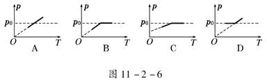 如图所示,一向右开口的汽缸放置在水平地面上,活塞可无摩擦移动且不漏气,汽缸中间位置有小挡板.初始时,外界大气压为p0,活塞紧压小挡板处,现缓慢升高缸内气体温度,则如图所示的p-T图象能正确反应缸内气体压强变化情况的是 ( )![]()