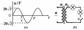 理想变压器原线圈接如图(a)所示的正弦交流电,副线圈连接两个完全相同的灯泡,规格为“2V,2W”,如图(b)所示。闭合开关S,两灯泡恰好能正常发光,则