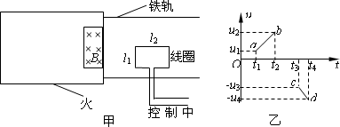 2006年7月1日,世界上海拔最高,线路最长的青藏铁路全线通车,青藏铁路安装的一种电磁装置可以向控制中心传输信号,以确定火车的位置和运动状态,其原理是将能产生匀强磁场的磁铁安装在火车首节车厢下面,如图甲所示(俯视图),当它经过安放在两铁轨间的线圈时,线圈便产生一个电信号传输给控制中心,线圈边长分别为l1和l2,匝数为n,线圈和传输线的电阻忽略不计.若火车通过线圈时,控制中心接收到线圈两端的电压信号u与时间t的关系如图乙所示(ab、cd均为直线),t1、t2、t3、t4是运动过程的四个时刻,则火车