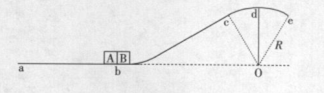 如图所示,一条轨道固定在竖直平面内,粗糙的ab段水平,bcde段光滑,cde段是以O为圆心、R为半径的一小段圆弧。可视为质点的物块A和B紧靠在一起,静止于b处,A的质量是B的3倍。两物体在足够大的内力作用下突然分离,分别向左、右始终沿轨道运动。B到d点时速度沿水平方向,此时轨道对B的支持力大小等于B所受重力的