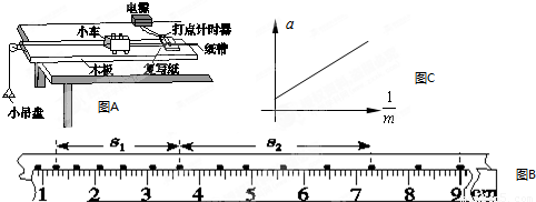 ③图C为实验小组以小车和砝码总质量数学公式为横坐标,小车的加速度a为纵坐标,在坐标纸上作出的a-数学公式关系图线.由图可分析得出:加速度与质量成________关系,(填“成正比”或“成反比”);图线不过原点说明实验有误差,引起这一误差的主要原因是平衡摩擦力时长木板的倾角________(填“过大”或“过小”).