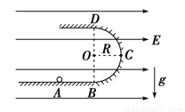 如图所示,ABCD为竖直放在场强为E=104 V/m的水平匀强电场中的绝缘光滑轨道,其中轨道的BCD部分是半径为R的半圆环,轨道的水平部分与半圆环相切,A为水平轨道上的一点,而且AB的长度=R=0.2 m.把一质量m=0.1 kg、带电量q=10-4 C的带正电小球,放在水平轨道的A点由静止开始释放后,在轨道的内侧运动.(g取10 m/s2)求:![]()