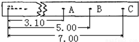 在一次实验中,质量m=1kg的重物自由下落,在纸带上打出一系列的点,如图所示(相邻计数点时间间隔为0.02s),单位cm,那么(1)纸带的________端与重物相连;(2)打点计时器打下计数点B时,物体的速度vB=________;(3)从起点O到打下计数点B的过程中重力势能减少量是△Ep=________,此过程中物体动能的增加量△Ek=________(g取9.8m/s2);(4)通过计算,数值上△Ep________△Ek(填“>”、“=”或“<”),这是因为________;(5)实验的结论是