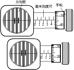 在“用双缝干涉测光的波长”实验中,准确读取光屏上条纹间距要用测量头,测量头由分划板、目镜、手轮等组成,如图所示.从目镜中看到的分划板是一个圆形,刻有水平和竖直两条细线以及两条短粗竖线,转动手轮一周,分划板连同刻度尺一起移动0.5mm.测量时先把分划板中心刻线与光屏上某一暗条纹中心对齐(这条称为第1条条纹),如上图所示,然后转动手轮,使分划板中心刻线移动到与第5条暗条纹的中心对齐,如下图所示.已知实验时使用的双缝的间距为d=0.60mm,双缝到光屏的距离为l=60cm.则入射光的波长是_________.