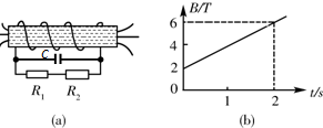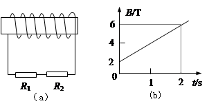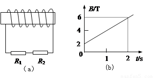 如图(a)所示的螺线管的匝数n=1500,横截面积S=20cm2,电阻r=1.5Ω,与螺线管串联的外电阻R1=10Ω,R2=3.5Ω。若穿过螺线管的磁场的磁感应强度按图(b)所示的规律变化,方向水平向右。计算R1上消耗的电功率。