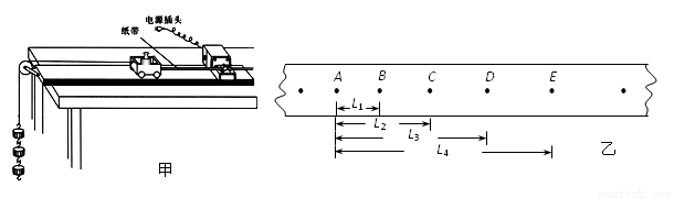 ②如图乙所示是某次实验中得到的一条纸带,其中A、B、C、D、E是计数点(每打5个点取一个计数点),距离如图,其中L1="3.07cm," L2="12.38cm," L3="27.87cm," L4=49.62cm。则打C点时小车的速度为_ ___m/s;加速度为_ ___m/s2。(计算结果均保留三位有效数字) ![]()
