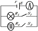 如图所示电路,电灯R1=24Ω,电动机绕组的电阻R0=1Ω,当电键S1、S2闭合时,测得电阻R1的电功率是P=96W,理想电流表的读数为I=5A,求此时: