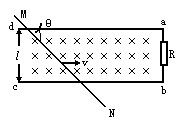 图中的da、cb为相距l的平行导轨(电阻很小,可以忽略),a、b间连接一个固定电阻,阻值为R.长直细杆MN可以按任意角θ架在平行导轨上,并以匀速v滑动(平移),v的方向和da平行.杆MN有电阻,每米长的电阻值为R.整个空间充满匀强磁场,磁感应强度的大小B,方向垂直纸面(dabc平面)向里.