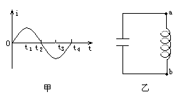 如图甲所示LC振荡电路的电流i随时间t变化的图像,规定流过线圈的电流向下为正方向,下列说法正确的是[ ]