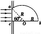 一块用折射率n=2的玻璃制作的透明体,其横截面如图所示,ab是一半径为R的圆弧,ac边与bc边垂直,∠aoc=60°.当一束平行黄色光垂直照射到ac边上后,ab弧的外表面只有一部分是黄亮的,而其余是暗的,求其黄亮部分的弧长是多少?