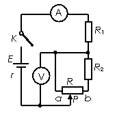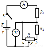 在如图所示电路中,电源电动势为6V,内阻为1Ω,电阻R1=5Ω,R2=6Ω,滑动变阻器的阻值0—30Ω。闭合电键K,当滑动变阻器的滑动触头P由a端向b端滑动时,理想电流表和理想电压表示数变化量的大小分别用ΔI、ΔU表示。则
