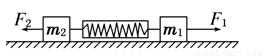 如图所示,两个质量分别为m1="3" kg、m2 = 2kg的物体置于光滑的水平面上,中间用轻质弹簧秤连接。两个大小分别为F1 =" 30" N、F2 =" 20" N的水平拉力分别作用在m1、m2上,则( )![]()