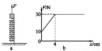 如图a所示,一轻质弹簧的下端固定在水平面上,上端放置一物体(物体与弹簧不连接)。初始时物体处于静止状态,现用竖直向上的拉力F作用物体上,使物体开始向上做匀加速运动,拉力F与物体位移X的关系如图b所示(g=10m/