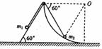 如图所示,左侧是倾角为60°的斜面,右侧是1/4圆弧面的物体,固定在水平地面上,圆弧面底端切线水平。一根轻绳两端分别系有质量为m1、m2的小球,跨过物体顶点的小定滑轮。当它们处于平衡状态时,连结小球m2的轻绳与水平线的夹角为60°,不计一切摩擦,两小球视为质点,则两小球的质量之比m1:m2等于