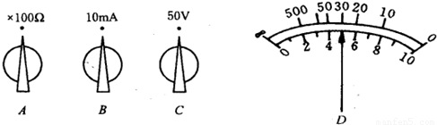 如图所示,A、B、C是多用电表在进行不同测量时转换开关分别指示的位置,D是多用表表盘指针在测量时的偏转位置.