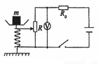 (4分)如图所示是某同学在科技活动中自制的电子秤原理图利用电压表的示数刻度指示物体的质量。托盘与电阻可忽略的弹簧相连,托盘与弹簧的质量均不计。滑动变阻器的滑动端与弹簧上端连接,当托盘中没有放物体时,电压表示数为零。设变阻器总电阻为R,总长度为L,电源电动势为E,内阻为r,限流电阻阻值为R0,弹簧劲度系数为k,若不计一切摩擦和其他阻力。求出电压表示数Ux与所称物体质量m的关系式为Ux= ![]()