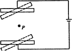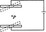 如图所示,两长平行金属板水平放置并接到电源上,一个带电微粒P位于两板间恰好平衡,现用外力将P固定,然后使两板各绕其中点转过α角,如图中虚线所示,撤去外力,则P在两板间