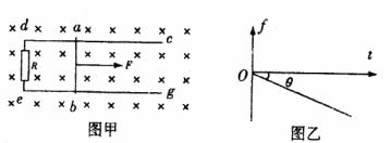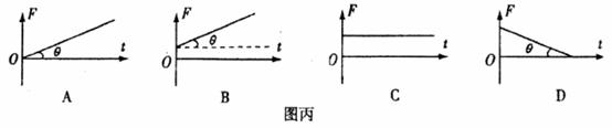 如图甲所示,水平放置固定的光滑平行金属轨道cd和eg处于方向竖直向下的匀强磁场中,金属杆ab与轨道接触良好。在两根轨道的端点d、e之间连接一电阻R,其它部分电阻忽略不计。现用一水平向右的外力作用在金属杆ab上,使金属杆由静止开始向右在轨道上滑动,运动中杆ab始终垂直于轨道。图乙为一段时间内金属杆受到的安培f-时间t的变化关系图象,则图丙中表示外力F随时间t变化关系的图象可能是