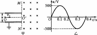 如图甲所示,水平放置的上、下两平行金属板,板长约为0.5 m,板间电压u随时间t呈正弦规律变化,函数图象如图乙所示.竖直虚线MN为两金属板右边缘的连线,MN的右边为垂直纸面向里的匀强磁场,磁感应强度为B,现在带正电的粒子连续不断的以速度v0=2×105 m/s沿两板间的中线