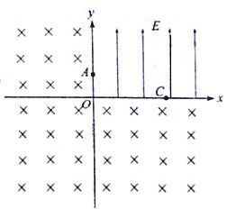 如图所示,在坐标系Oxy的第一象限中在在沿y轴正方向的匀强电场,场强大小为E。在其它象限中在在匀强磁场,磁场方向垂直于纸面向里,A是y轴上的一点,它到坐标原点O的距离为h;C是x轴上的一点,到O点的距离为l,一质量为m、电荷量为q的带负电的粒子以某一初速度沿x轴方向从A点进入电场区域,继而通过C点进入磁场区域,并再次通过A点,此时速度方向与y轴正方向成锐角。不计重力作用。试求: