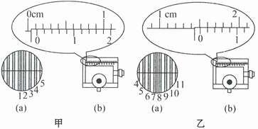 (1)已知测量头主尺的最小刻度是毫米,副尺上有50分度.某同学调整手轮后,从测量头的目镜看去,第一次映入眼帘的干涉条纹如图甲(a)所示,图中数字是该同学给各暗纹的编号。(1)此时图甲(b)中游标尺上的读数