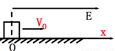 (8分)在一个水平面上建立x轴,在过原点O垂直于x轴的平面的右侧空间有一个匀强电场,如图所示,场强大小E=6×105N/C,方向与x轴正方向相同,在O处放一个带电量q= 5×10-8C、质量m=0.010kg的带负电绝缘物块。物块与水平面间的动摩擦因数μ=0.2,现在沿x轴正方向给物块一个初速度V0=2m/s,求物块最终停止时的位置。(g取10m/s2)