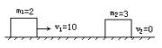 在光滑水平面上有质量分别为m1=2kg,m2=3kg的木块. m2原来静止,m1以向右的速度v1=10m/s与m2做对心碰撞,如图所示.分析说明m1、m2碰撞分开后的速度可能取值范围.