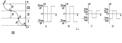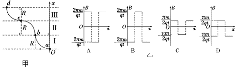 Ⅰ,沿曲线abcd运动,ab、bc、cd都是半径为R的圆弧.粒子在每段圆弧上运动的时间都为t.规定垂直于纸面向外的磁感应强度为正,则磁场区域Ⅰ、Ⅱ、Ⅲ三部分的磁感应强度B随x变化的关系可能是图乙中的 ( )