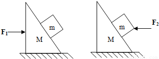 如图所示,质量为M的斜面放置于水平面上,其上有质量为m的小物块,各接触面均无摩擦力,第一次将水平力F1加在M上,第二次将F2加在m上,两次都要求m与M不发生相对滑动,则F1与F2的比为( )