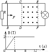 如图所示,水平面上有两电阻不计的足够长的光滑金属导轨平行固定放置,间距d为0.5 m,左端通过导线与阻值为2 W的电阻R连接,右端通过导线与阻值为4 W的小灯泡L连接,在CDEF矩形区域内有竖直向上的匀强磁场,CE长为2 m,CDEF区域内磁场的磁感应强度B随时间变化如图所示,在t=0时,一阻值为2 W的金属棒在恒力F作用下由静止开始从AB位置沿导轨向右运动,当金属棒从AB位置运动到EF位置过程中,小灯泡的亮度没有发生变化,求: