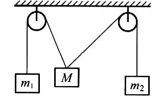 m1、m2和M的重物,两滑轮的悬挂点在同一高度,不计摩擦.求当整个系统处于平衡状态时,三个重物质量之间的关系.湖北省互联网违法和不良信息举报平台 | 网上有害信息举报专区 | 电信诈骗举报专区 | 涉历史虚无主义有害信息举报专区 | 涉企侵权举报专区
