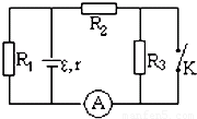 精英家教网在如图所示的电路中,电阻R1=12Ω,R2=8Ω,R3=4Ω.当电键K断开时,电流表示数为0.25A,当K闭合时电流表示数为0.36A.求:
