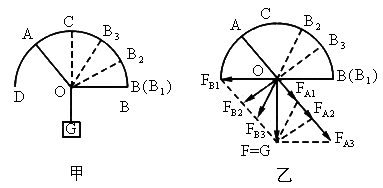如图甲所示,半圆形支架BAD,两细绳OA和OB结于圆心O,下悬重为C的物体.使OA绳固定不动,在将OB绳的B端沿半圆支架从水平位置逐渐移至竖直的位置C的过程中,分析OA绳和OB绳所受的力的大小如何变化.