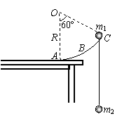 (2013上海徐汇区期末)如图所示,圆心在O点、半径为R的光滑圆弧轨道ABC竖直固定在水平桌面上,OC与OA的夹角为60°,轨道最低点A与桌面相切. 一足够长的轻绳两端分别系着质量为m1和m2的两小球(均可视为质点),挂在圆弧轨道光滑边缘C的两边,开始时m1位于C点