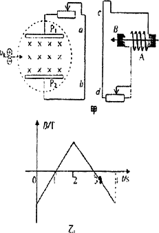 等离子气流由左方连续以v0射入P1、P2两板间的匀强磁场中,ab直导线与P1、P2相连接,线圈A与直导线cd连接.线圈A内有随图乙所示的变化磁场,且磁场B的正方向规定为向左,如图甲所示,则下列叙述正确的是