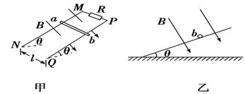 (19分)如图甲所示,两根足够长的直金属导轨MN、PQ平行放置在倾角为θ的绝缘斜面上,两导轨间距为l.M、P两点间接有阻值为R的电阻.一根质量为m的均匀直金属杆ab放在两导轨上,并与导轨垂直.整套装置处于磁感应强度为B的匀强磁场中,磁场方向垂直斜面向下.导轨和金属杆的电阻可忽略.让ab杆沿导轨由静止开始下滑,导轨和金属杆接触良好,不计它们之间的摩擦.![]()