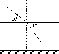 如图所示,某透明液体深1m,一束与水平面成30o角的光线从真空照向该液体,进入该液体的光线与水平面的夹角为45o。试求:(真空的光速c≈3.0×108m/s)