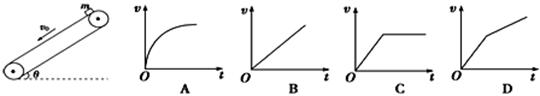 如图所示,足够长的传送带与水平面夹角为θ,以速度v0逆时针匀速转动.在传送带的上端轻轻放置一个质量为m的小木块,小木块与传送带间的动摩擦因数μ< tanθ,则图中能客观地反映小木块的速度随时间变化关系的是 ( )![]()