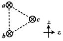在等边三角形的三个顶点a、b、c处各有一条长直导线垂直穿过纸面,导线中通有大小相等的恒定电流方向如图。过c点的导线所受安培力的方向( )![]()