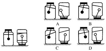 如图所示,体积相同的小铁球(如图中黑色球所示)和小塑料球(如图中白色球所示)分别用细线系于两个带盖的盛水的瓶子中,当两瓶和车一起加速向右运动时,会发生的现象最接近图中的哪一种情景( )![]()